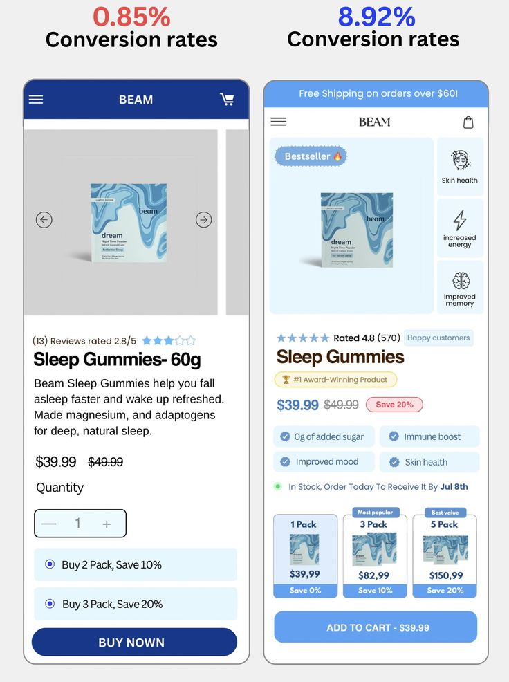 Conversion optimization elements designed to increase purchase likelihood and average order value. This section evaluates upsells, bundles, scarcity triggers, urgency messaging, and related product recommendations.