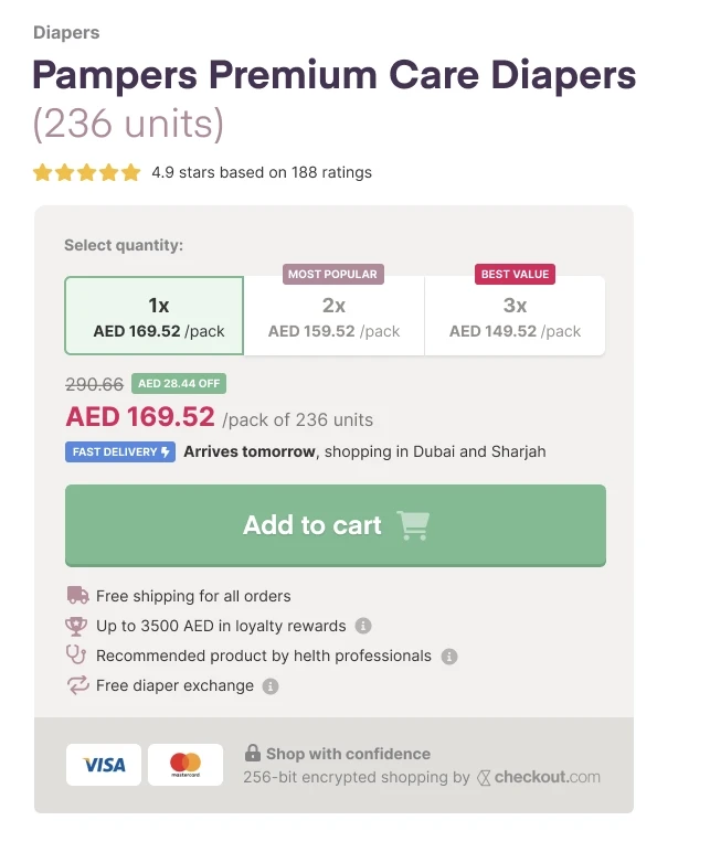 Clear quantity-based discounts should be shown near the main CTA (for example buy 2 or 3 items at a lower price per unit).