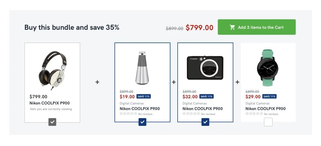 Conversion optimization elements that increase purchase likelihood and average order value, such as upsells, bundles, urgency messages, and scarcity triggers.