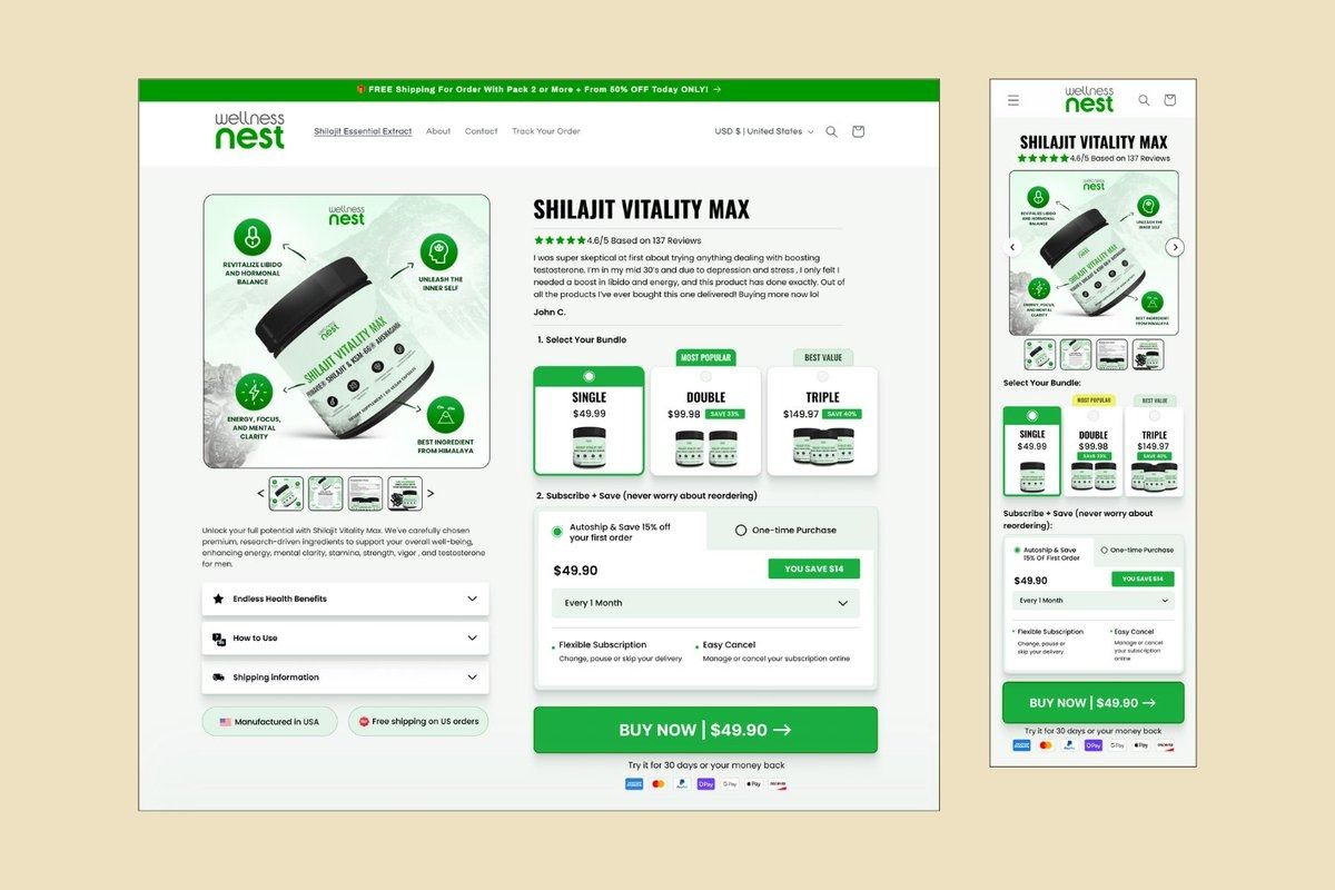 The primary conversion area of the landing page. This section evaluates the visibility of the main CTA, pricing clarity, variant selectors, shipping information, and purchase triggers.